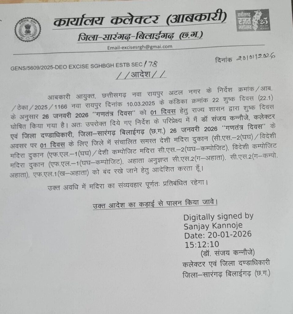 सारंगढ़ बिलाईगढ़// कलेक्टर एवं जिला दण्डाधिकारी डॉ संजय कन्नौजे ने गणतंत्र दिवस पर 26 जनवरी को सारंगढ़-बिलाईगढ़ जिले में मदिरा शुष्क दिवस का आदेश जारी किया है।