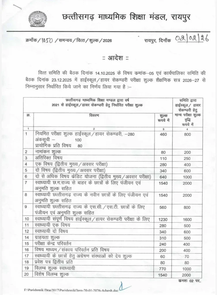 रायपुर// बोर्ड परीक्षार्थियों के लिए बुरी खबर है। बोर्ड परीक्षार्थियों को अब पहले की तुलना में दोगुनी परीक्षा फीस देनी होगी। इस संबंध में माशिमं ने आदेश जारी कर दिया है। आखिरी बार साल 2021 में परीक्षा फीस बढ़ायी गयी थी, अब पांच साल बाद 10वी और 12वी का परीक्षा शुल्क बढ़ाया गया है।