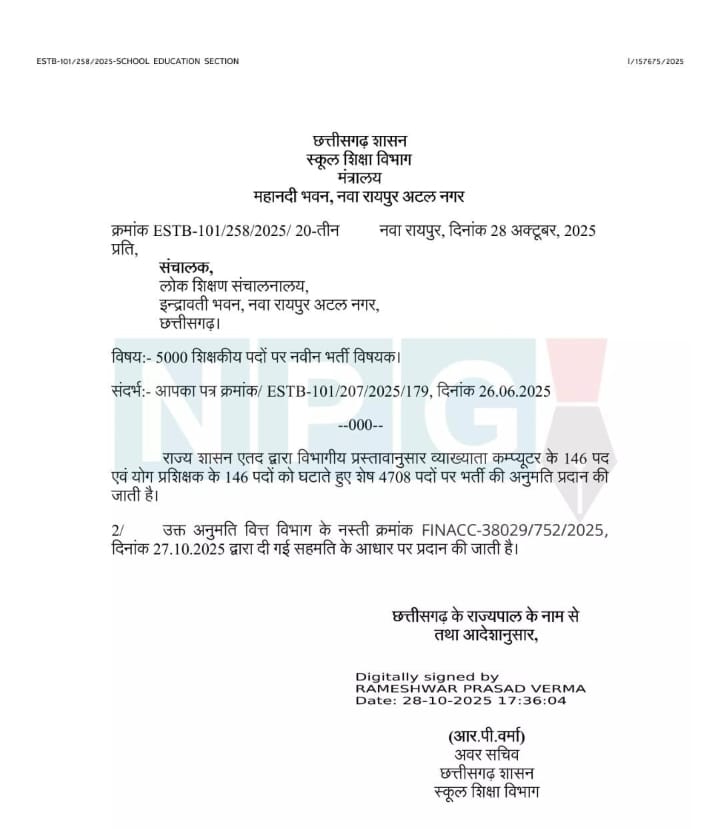रायपुर// छत्तीसगढ़ में शिक्षक भर्ती का इंतजार कर रहे युवाओं को लेकर बड़ी खबर सामने आयी है। प्रदेश में शिक्षकों की नई भर्ती का रास्ता साफ हो गया है। राज्य सरकार ने इसका आदेश जारी कर दिया है। फिलहाल 5000 में से योग प्रशिक्षक के 146 और व्याख्याता कंप्युटर के 146 पदों को कम कर दिया गया है यानि कुल 4708 पदों पर शिक्षकों की भर्ती की जाएगी।