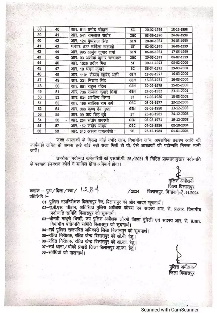 बिलासपुर/ जिला पुलिस अधीक्षक कार्यालय ने जिले के पुलिस विभाग में पदस्थ 56 आरक्षकों और महिला आरक्षकों की सूची जारी की है। सूची में उल्लेखित आरक्षकों को प्रधान आरक्षक के तौर पर पदोन्नत किया गया है। जारी आदेश में यह भी बताया गया है कि यदि सूची में शामिल किसी पुलिसकर्मी के खिलाफ कोई विभागीय जांच या प्रकरण लंबित पाया जाता है तो उनका प्रमोशन निरस्त माना जाएगा। पदोन्नति प्रावधानों के मुताबिक़ सभी कर्मियों को इंडक्शन कार्यक्रम में शामिल होना अनिवार्य है।