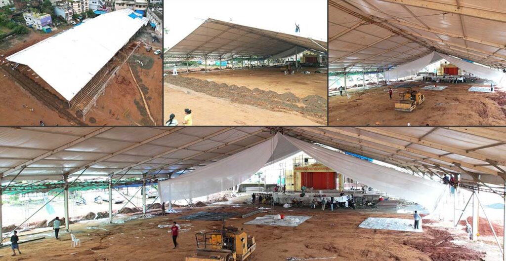 कलेक्टर कार्तिकेया गोयल व पुलिस अधीक्षक दिव्यांग पटेल के मार्गदर्शन में कार्यक्रम के अनुरूप आयोजन स्थल पर भव्य पंडाल और मंच तैयार करने का काम तेजी से चल रहा है। श्रमिक दिन रात इस काम में जुटे हुए हैं। ईई पीडब्ल्यूडी अमित कश्यप ने बताया कि कार्यक्रम स्थल पर वाटर प्रूफ पंडाल तैयार किया जा रहा है। जो कि लगभग 29 हजार स्क्वायर फीट में तैयार हो रहा है। जिसमें मुख्य डोम लगभग 22 हजार स्क्वायर फीट का है, जो कि वाटर प्रूफ है। जिसके बाद पीछे 3 हजार स्क्वायर फीट वाटर प्रूफ पंडाल भी तैयार किया जाएगा। इसके अलावा दोनों बाजू में मिलाकर साढ़े 4500 स्क्वायर फीट का अतिरिक्त पंडाल भी तैयार किया जा रहा है। मंच के पीछे कलाकारों के ग्रीन रूम भी रेडी किए जा रहे हैं। रामलीला मैदान को सुखा लिया गया है। यहां मिट्टी डाली गई है जिसे रोलर चलाकर समतल किया जा रहा है। इसके अलावा बारिश के मद्देनजर पंडाल के दोनों बाजू में नाली बनाकर पानी निकासी की व्यवस्था भी तैयार कर ली गई है। जिससे बारिश होने पर साइड से पानी अंदर न घुसे।