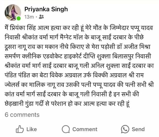 मौत से पहले प्रियंका सिंह ने फेसबुक पोस्ट में बताया कि मैं प्रियंका सिंह आत्महत्या कर रही हूं। मेरे मौत की जिम्मेदार पप्पू यादव निवासी श्रीकांत वर्मा मार्ग, नागू राव, मेरे पड़ोसी डॉक्टर अजीत मिश्रा समर्पण क्लिनिक, हाईकोर्ट एडवोकेट दीप्ति शुक्ला, बिलासपुर निवासी सांई दरबार, अनिल शुक्ला साई दरबार का पंडित, पंडित का बेटा, विवेक अग्रवाल और विक्की अग्रवाल श्री राम ज्वेलर्स का मालिक, नागू राव की पत्नी, पप्पू यादव की पत्नी सभी है। इन सभी की छेड़खानी और गुंडागर्दी से परेशान होकर मैं आत्महत्या कर रही हूं।