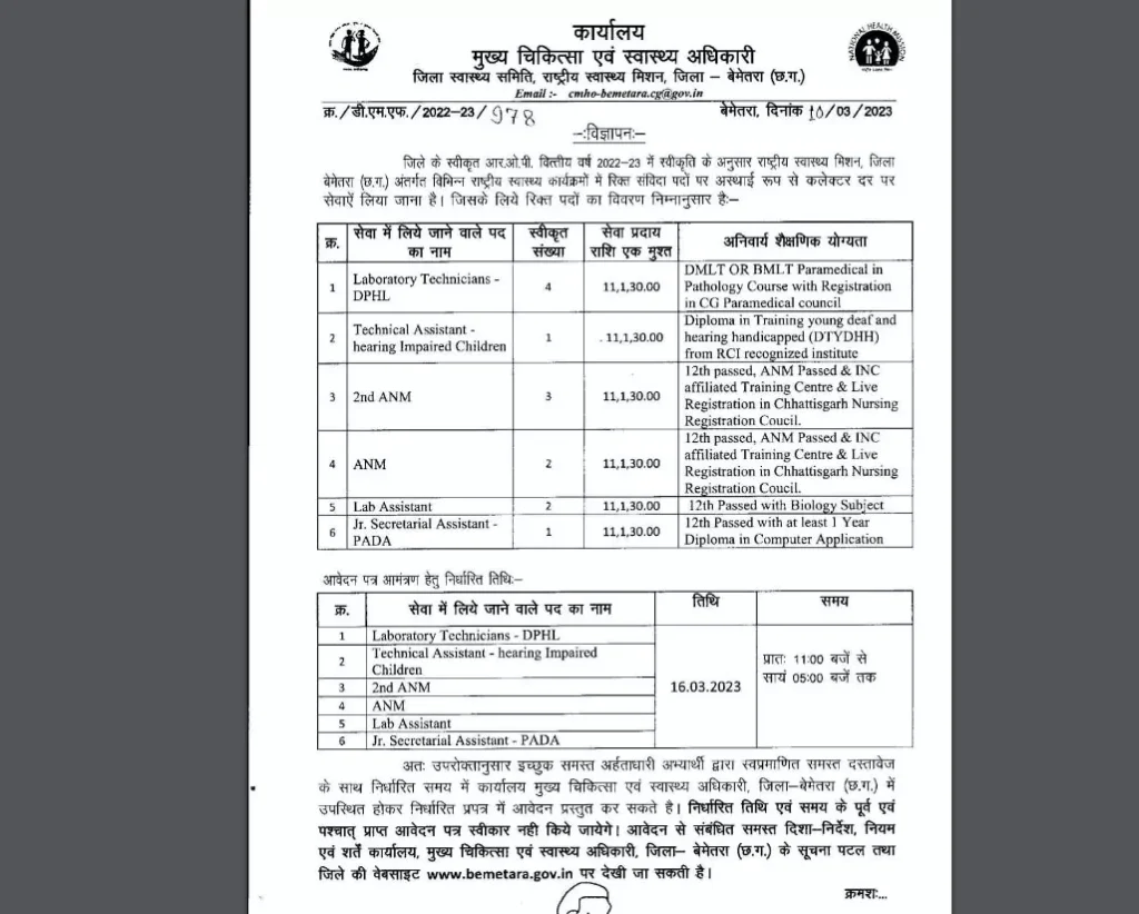 बेमेतरा/ राष्ट्रीय स्वास्थ्य मिशन जिला बेमेतरा अंतर्गत विभिन्न राष्ट्रीय कार्यक्रमों में रिक्त संविदा पदों पर वाक इन इन्टरव्यू के माध्यम से कलेक्टर दर पर अस्थाई रूप से पद स्वीकृत किये गए हैं। इच्छुक अर्हताधारी अभ्यर्थी अपना आवेदन निर्धारित प्रारूप में स्वप्रमाणित समस्त आवश्यक दस्तावेज के साथ 16 मार्च 2023 प्रातः 11:00 बजे से सायं 5:00 बजे तक कार्यालय मुख्य चिकित्सा एवं स्वास्थ्य अधिकारी जिला बेमेतरा में स्वयं उपस्थित होकर आवेदन पत्र प्रस्तुत कर सकतें है।