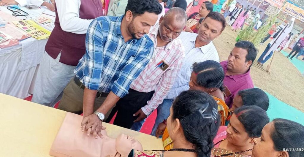 सारंगढ़ बिलाईगढ़// भारतीय रेडक्रॉस सोसाइटी के जिला सारंगढ़ बिलाईगढ़ इकाई द्वारा सारंगढ़ में आयोजित राज्योत्सव में सीपीआर प्रदर्शनी लगाई गई, जिसमें राज्य उत्सव देखने आए लोगों को दुर्घटना आपदा में बेहोश व्यक्ति की देखभाल कर पुनः होश में लाना एवं सांस फिर से शुरू करना, दिल की धड़कन बंद होने को फिर से चालू करने की विधि को पुतले के साथ प्रेक्टिकल करवाई गई।