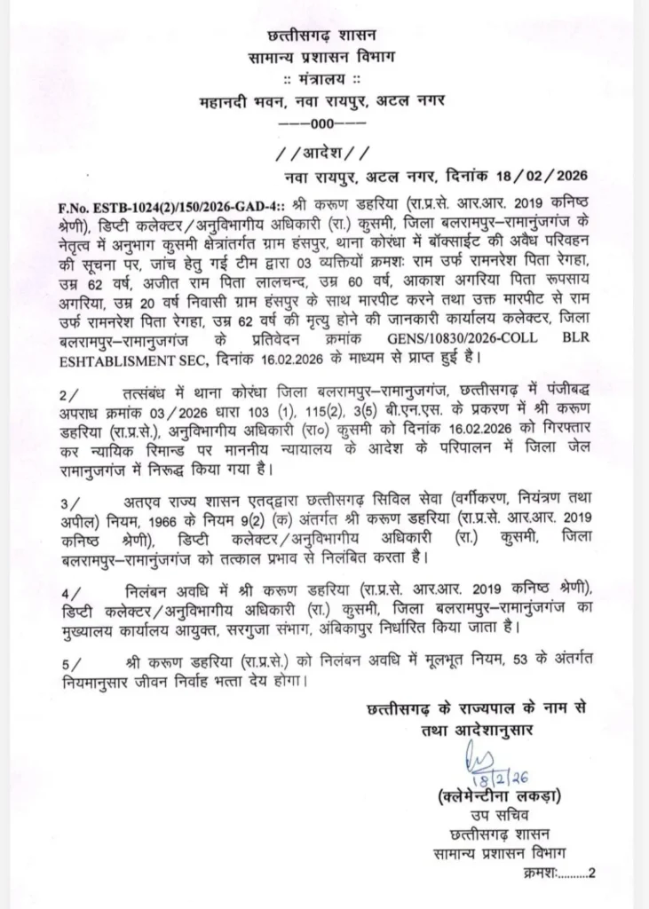 रायपुर// छत्तीसगढ़ में एक बुजुर्ग की कथित पिटाई से मौत के मामले में राज्य सरकार ने कड़ा रुख अपनाते हुए एसडीएम करुण डहरिया को निलंबित कर दिया है। इससे पहले पुलिस ने उन्हें गिरफ्तार किया था। इस मामले में एसडीएम सहित कुल चार आरोपियों को गिरफ्तार किया गया है। घटना के बाद क्षेत्र में तनाव की स्थिति बन गई थी और ग्रामीणों ने सख्त कार्रवाई की मांग की थी।