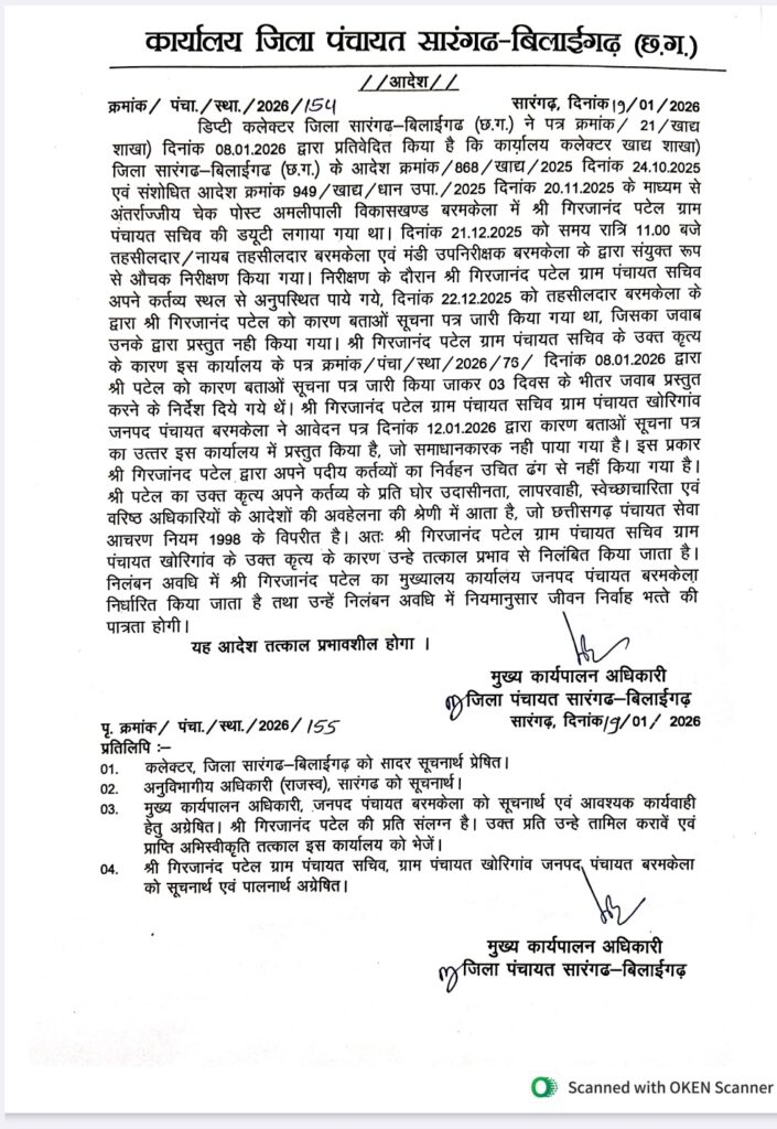 गिरजानंद पटेल ग्राम पंचायत सचिव को जिला पंचायत कार्यालय द्वारा 8 जनवरी को कारण बताओ सूचना पत्र जारी किया, जिसमें 03 दिवस के भीतर जवाब प्रस्तुत करने के निर्देश दिये गये थे। गिरजानंद पटेल ने 12 जनवरी को कारण बताओं सूचना पत्र का उत्तर प्रस्तुत किया है, जो समाधानकारक नहीं पाया गया और उनके द्वारा अपने पदीय कर्तव्यों का निर्वहन उचित ढंग से नहीं किया गया, अपने कर्तव्य के प्रति घोर उदासीनता, लापरवाही, स्वेच्छाचारिता एवं वरिष्ठ अधिकारियों के आदेशों की अवहेलना किया गया जो छत्तीसगढ़ पंचायत सेवा आचरण नियम 1998 के विपरीत है। इस कारण जिला पंचायत सीईओ इंद्रजीत बर्मन ने गिरजानंद पटेल सचिव ग्राम पंचायत खोरिगांव को तत्काल प्रभाव से निलंबित किया है। निलंबन अवधि में गिरजानंद पटेल का मुख्यालय कार्यालय जनपद पंचायत बरमकेला रहेगा और निलंबन अवधि में उन्हें नियमानुसार जौवन निर्वाह भत्ते दी जाएगी।