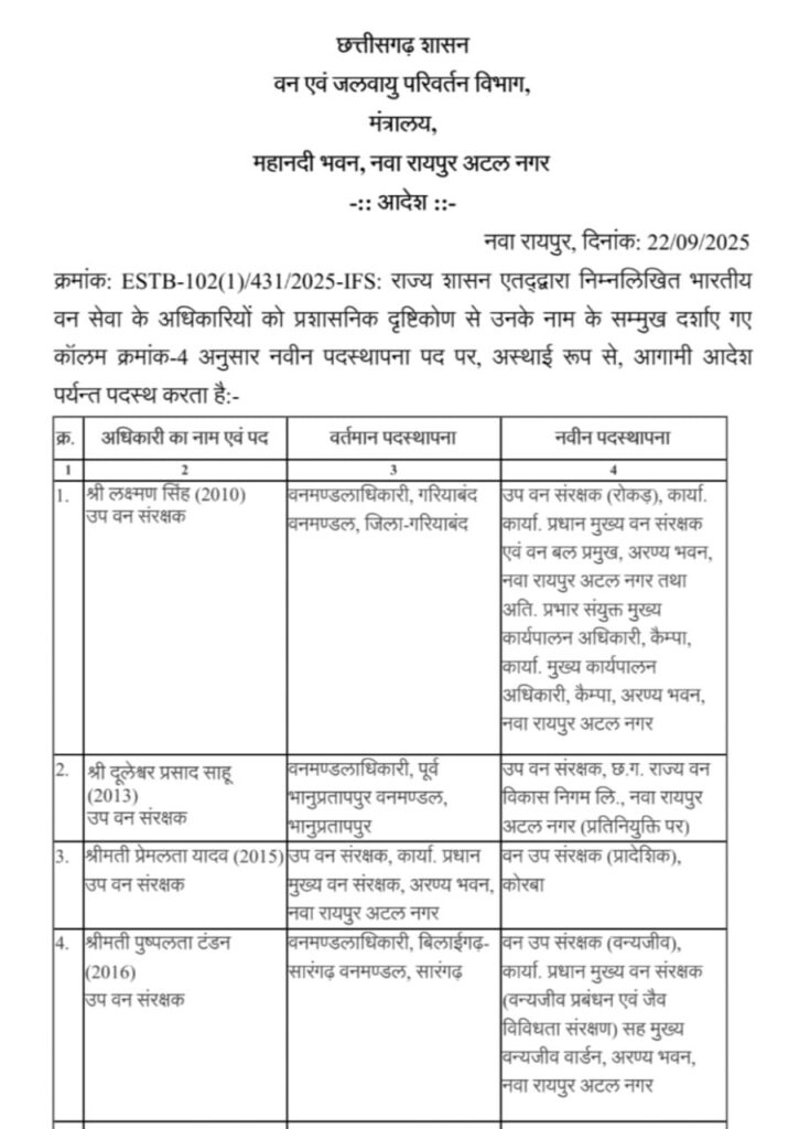 - प्रेमलता यादव (2015) उप वन संरक्षक, उप वन संरक्षक, कार्य. प्रधान मुख्य वन संरक्षक, अरण्य भवन, नवा रायपुर को वन उप संरक्षक (प्रादेशिक), कोरबा भेजा गया है।