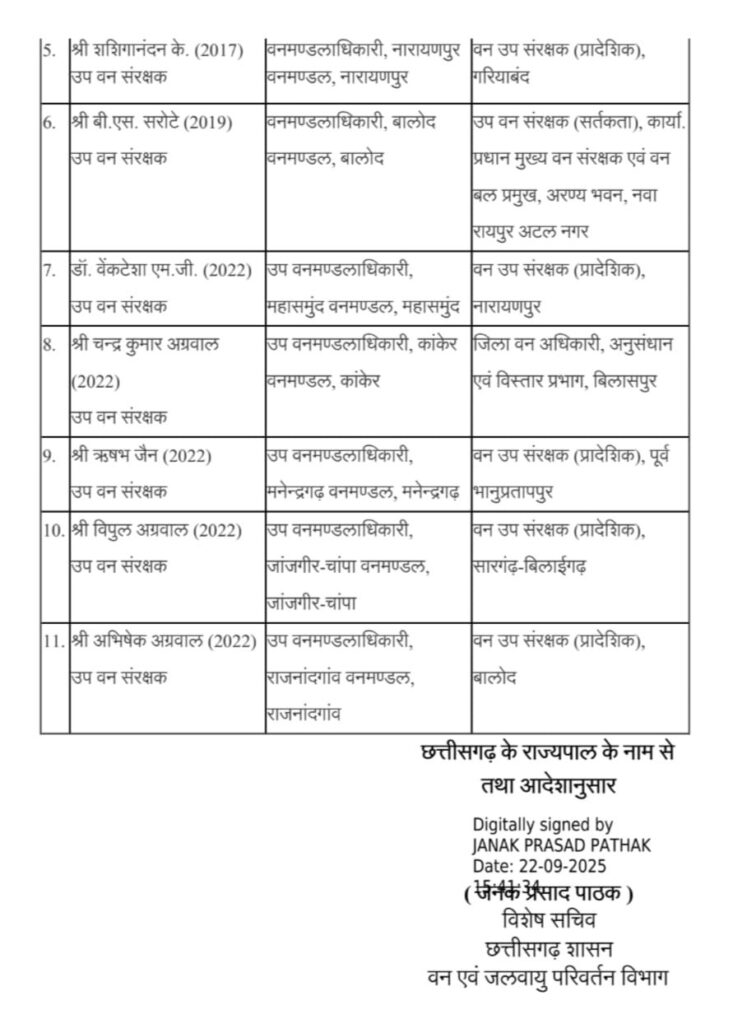 - अभिषेक अग्रवाल (2022) उप वन संरक्षक, उप वनमण्डलाधिकारी, राजनांदगांव वनमण्डल, राजनांदगांव को वन उप संरक्षक (प्रादेशिक), बालोद भेजा गया है।