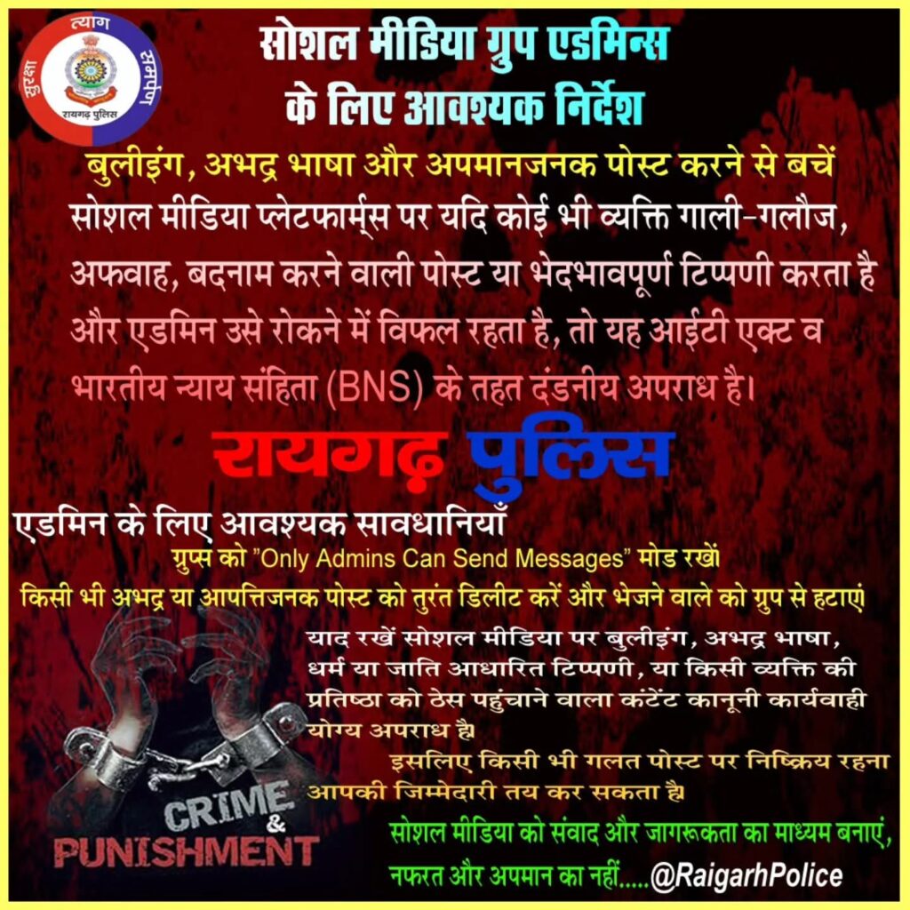 अपने ऑफिशल इंस्टाग्राम और फेसबुक पेज में पोस्ट करते हुए रायगढ़ पुलिस ने ज़ोर देकर कहा है कि सोशल मीडिया को नफरत और अपमान फैलाने का नहीं, बल्कि संवाद और जागरूकता का माध्यम बनाना चाहिए। यह निर्देश सोशल मीडिया के ग्रुप एडमिन के लिए एक स्पष्ट चेतावनी है कि उन्हें अपने प्लेटफॉर्म पर साझा की जाने वाली सामग्री पर कड़ी निगरानी रखनी होगी। भारतीय न्याय संहिता लागू होने के बाद डिजिटल प्लेटफॉर्म पर गैर-कानूनी कंटेंट के प्रसार को लेकर कानूनी प्रावधान और भी सख्त हो गए हैं।