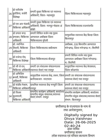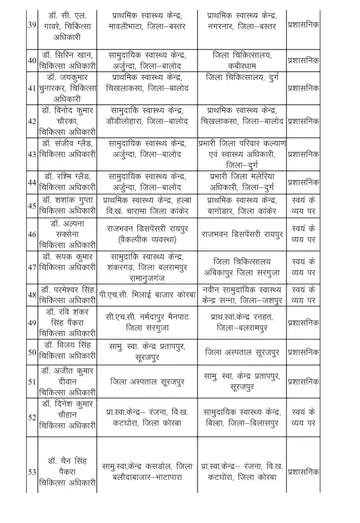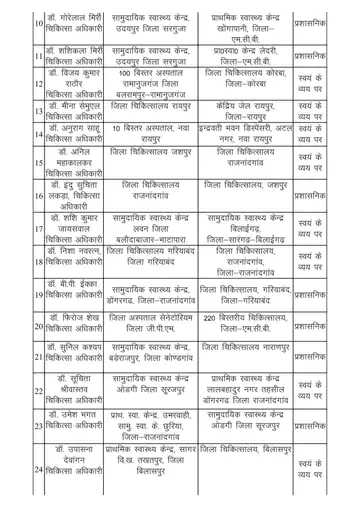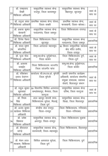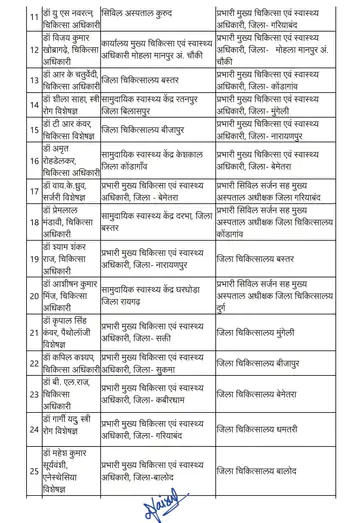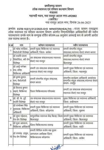 रायपुर/ छत्तीसगढ़ के स्वास्थ्य विभाग ने 100 डॉक्टर्स का ट्रांसफर किया है। इनमें अलग-अलग जिला चिकित्सालय में इलाज की जिम्मेदारी संभालने वाले डॉक्टर्स शामिल हैं। प्रशासनिक जिम्मेवारी संभालने वाले संभाग के प्रभारी संचालक और प्रभारी मुख्य चिकित्सा अधिकारी भी शामिल हैं। नई जगहों पर पोस्टिंग का आदेश जारी कर दिया गया है।