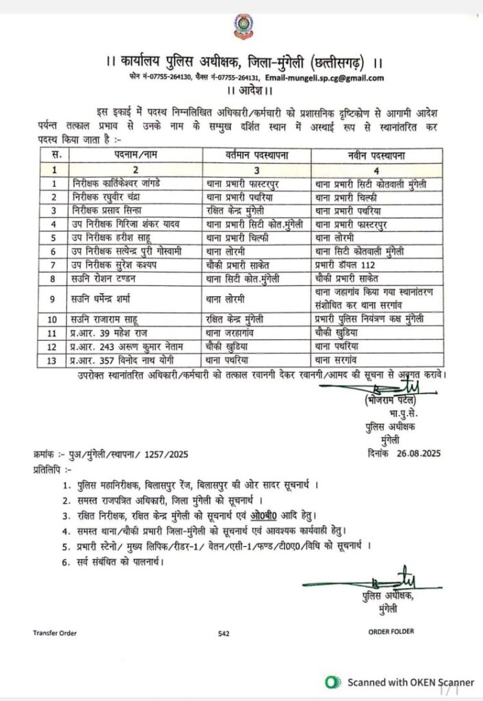 मुंगेली// मुंगेली पुलिस विभाग में बड़ी संख्या में तबादला किया गया है। पुलिस अधीक्षक द्वारा प्रशासनिक दृष्टिकोण से इस हेतु आदेश जारी किया गया है। जारी आदेश के अनुसार थाना प्रभारी, निरीक्षक, उप निरीक्षक एवं प्रधान आरक्षकों के ट्रांसफर किए हैं।