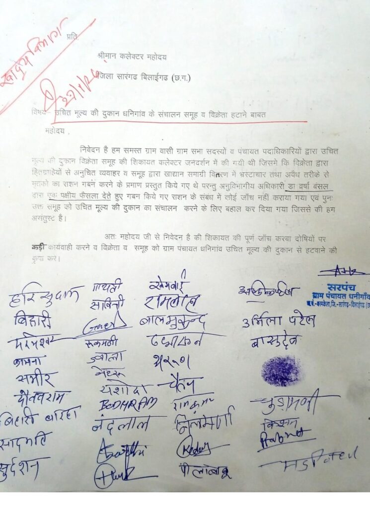 ग्राम पंचायत धनीगांव के सरपंच अभिषेक नायक, अभिमन्यु पटेल, उर्मिला पटेल सहित करीब 50 से 60 ग्रामीणों ने कलेक्टर को लिखित शिकायत सौंपते हुए दोबारा जांच कराने और अन्नपूर्णा महिला स्व सहायता समूह व राशन विक्रेता को हटाने की मांग की है। ग्रामीणों का कहना है कि जब तक सही जांच नहीं होगी, तब तक उन्हें न्याय नहीं मिलेगा। इस मामले में कलेक्टर डॉ संजय कन्नौजे ने ग्रामीणों को उचित कार्रवाई का आश्वासन दिया है।
